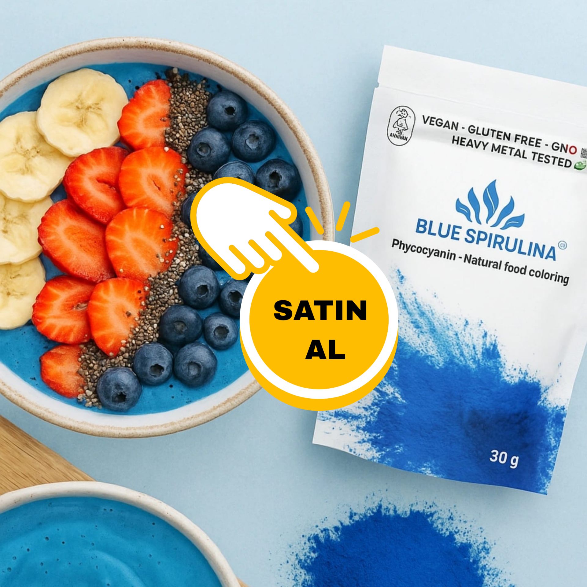 Blue spirulina, mavi rengiyle öne çıkan, spirulina alginden elde edilen doğal bir pigmenttir. Aslında bu ürün, spirulinanın içindeki fikosiyanin adlı mavi renkli bileşenin ayrıştırılmış ve yoğunlaştırılmış halidir. Klasik yeşil spirulinadan farklı olarak tadı daha nötrdür; bu nedenle smoothie, yoğurt, latte ve tatlı tariflerinde rengi bozmadan kullanılabilir. Antioksidan bakımından zengindir ve serbest radikallerle savaşmaya yardımcı olur. Bitkisel bir içerik olduğu için vegan ve vejetaryen beslenmeye de uygundur.